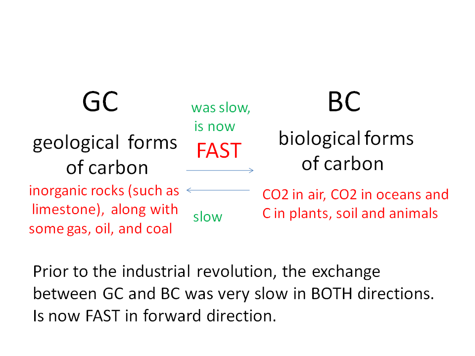 In addition, GC does not naturally change to BC and BC does not naturally change to GC. Therefore, the natural world contains a specific amount of BC that has remained constant for millions of years – until mankind learned how to generate energy by the combustion of fossil fuels. The present global warming problem has been caused by the exceedingly rapid rate with which man has been converting GC to BC by the combustion of fossil fuels. The biological world now contains about 40% more carbon than it did just 160 years ago! While the plants might like the EXTRA CO2 man has been adding to the BC cycle, both the atmosphere and the oceans do not.